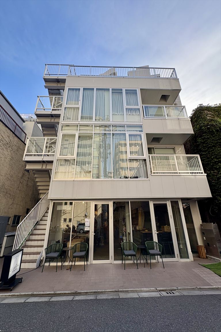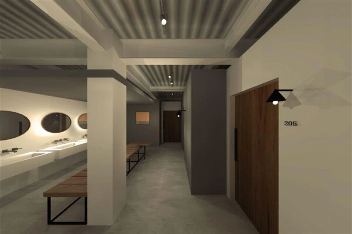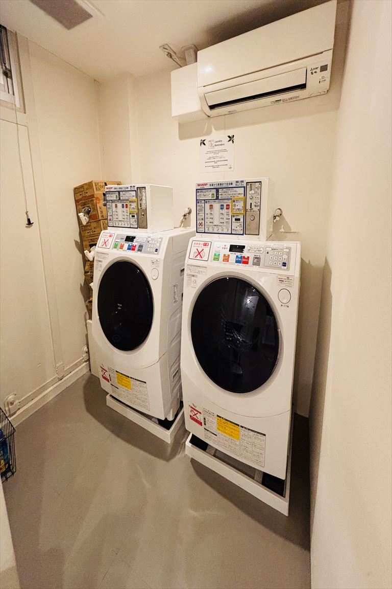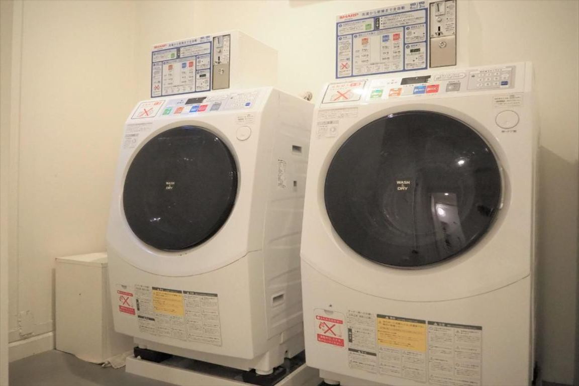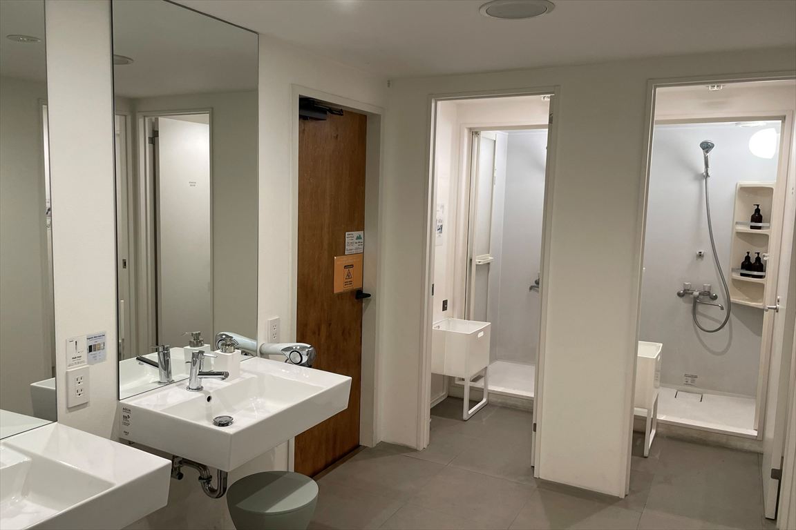外観、共用シャワールーム、共用トイレ、コインランドリー、共用スペース(2階・3階)